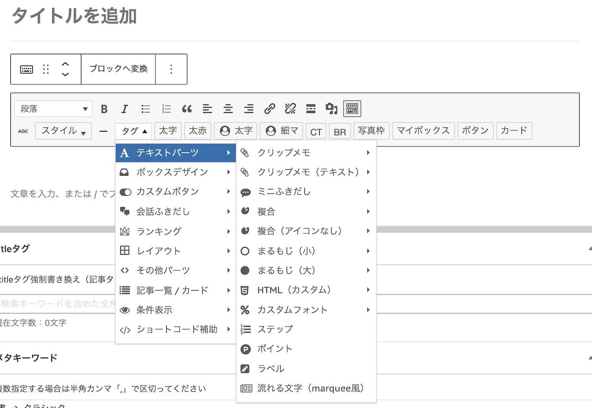 クラシックで書くときのツールバーに、アフィンガーサイトで見るようなパーツが入っています。