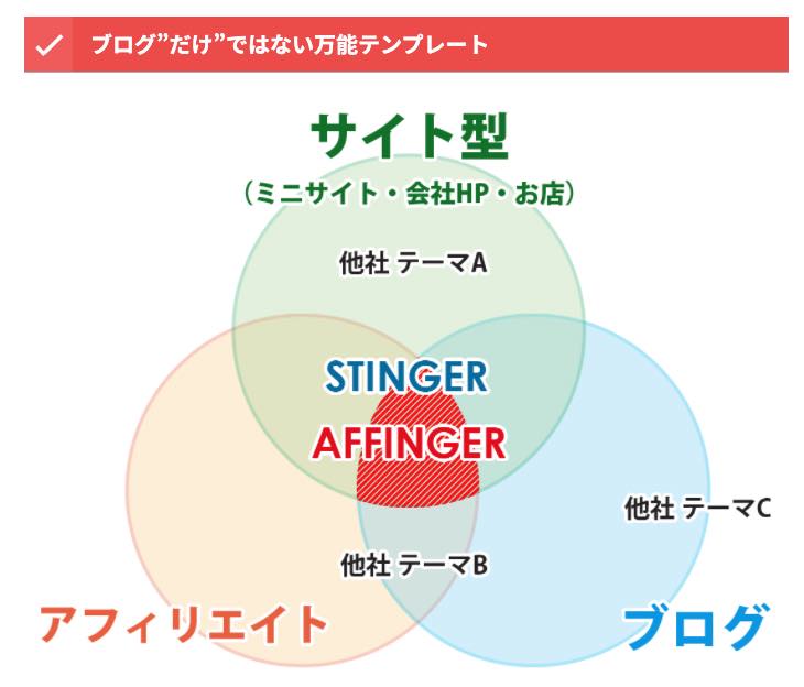 | AFFINGER (アフィンガー) | 14,800円 | 稼ぐことに特化したアフィリエイト機能が充実。 多機能でカスタマイズ性が高く、他者との差別化ができる。 |