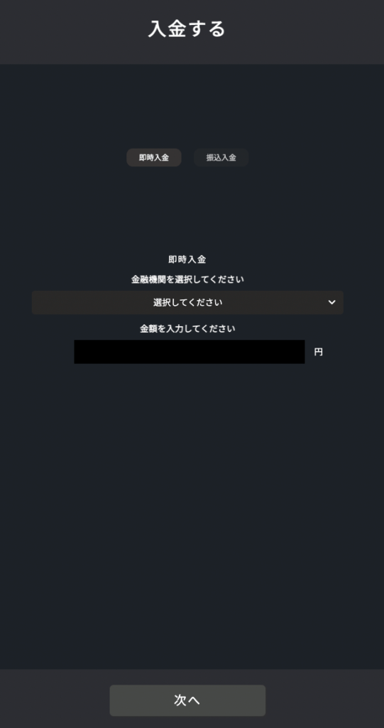 『即時入金』を選択し、金融機関と金額を入力し、『次へ』をクリックします。