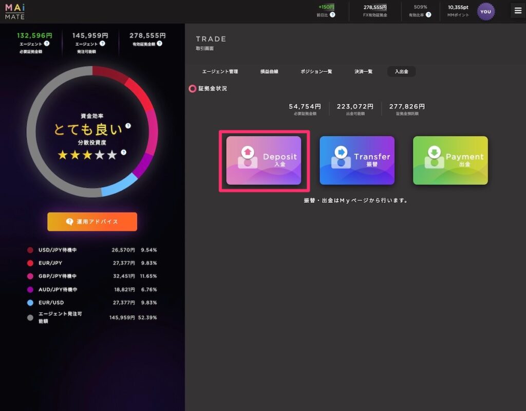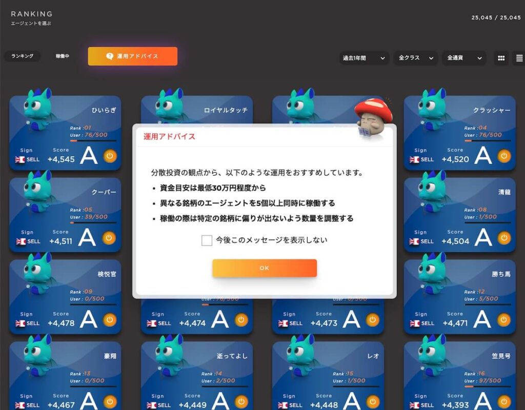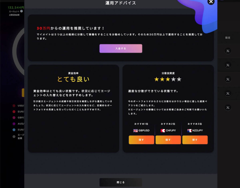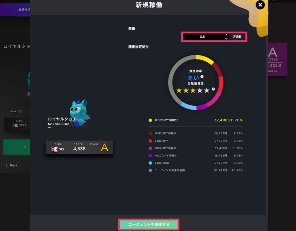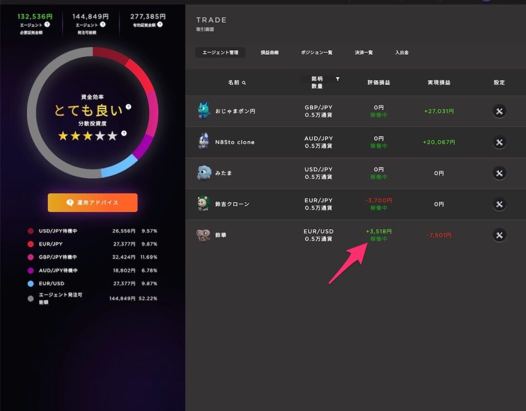 • 資金効率は『とても良い』を維持しています。入金額に対して、エージェントを多く選びすぎると過剰投資となり、資金効率が悪くなります。
