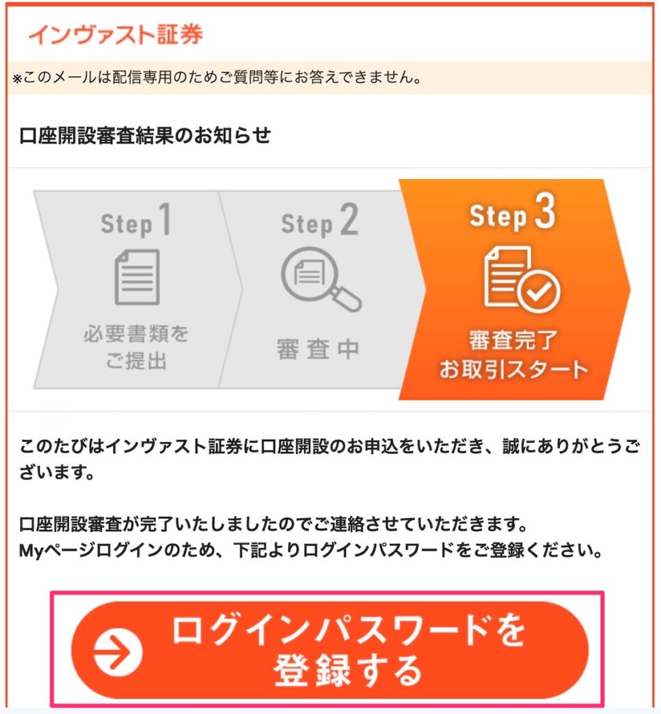 「口座開設審査結果のお知らせ」メールを下にスクロールし、『ログインパスワードを登録する』をクリックし、画面に従って進みます。