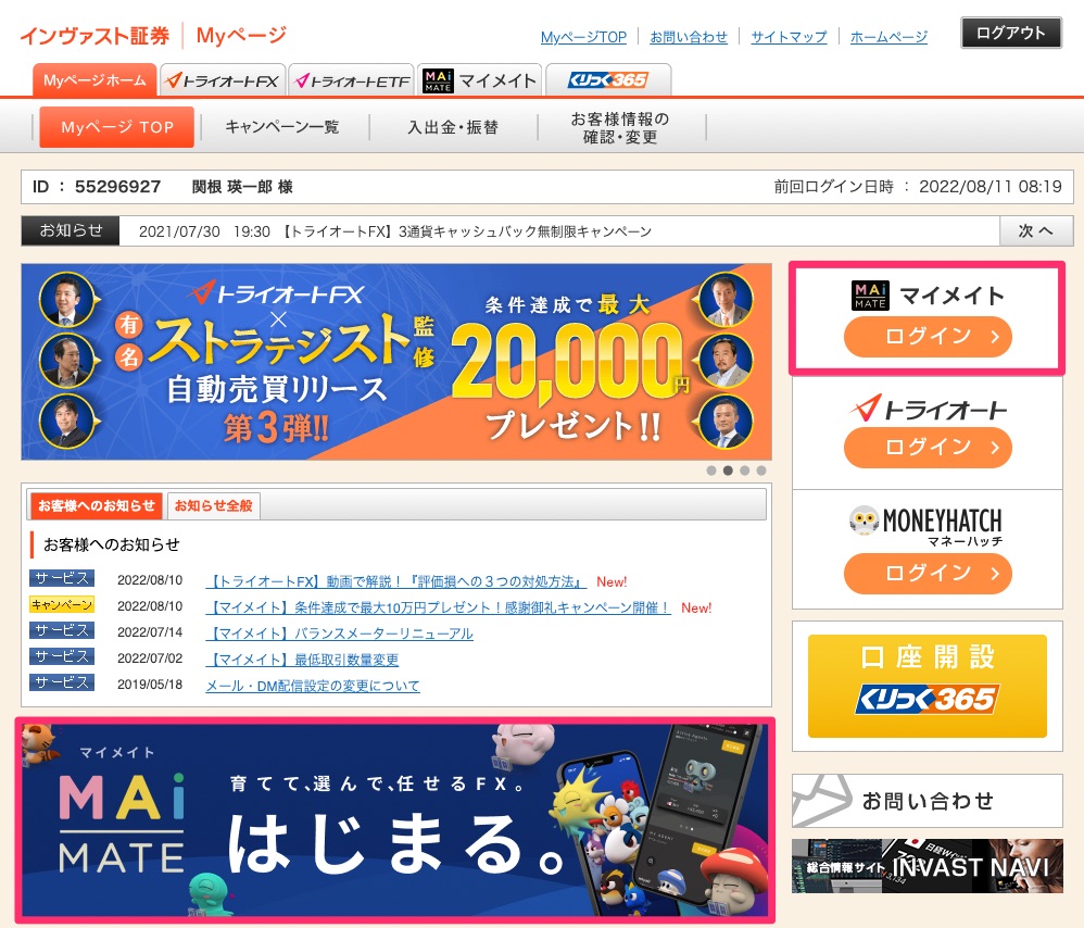 次に、インヴァスト証券の口座とマイメイトの取引口座を接続させます。