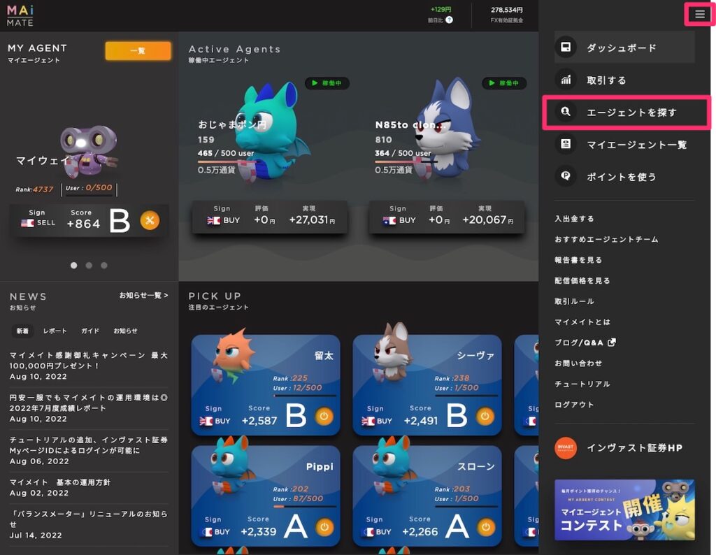 マイメイトの右上の『横棒3本』→『エージェントを探す』の順に、クリックします。