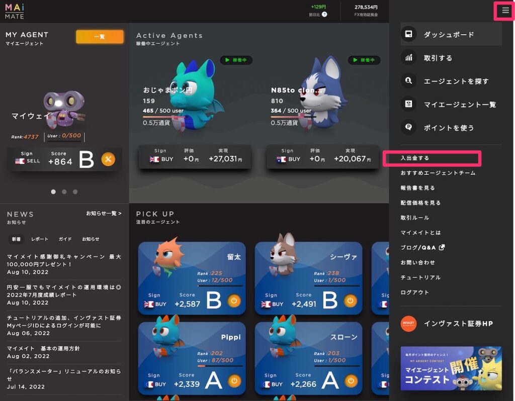 マイメイトの右上の『横棒3本』→『入出金する』の順に、クリックします。
