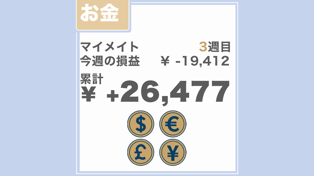 | 通貨ペア | 今週の実現損益 | 累計の実現損益 | 現在の評価損益 |