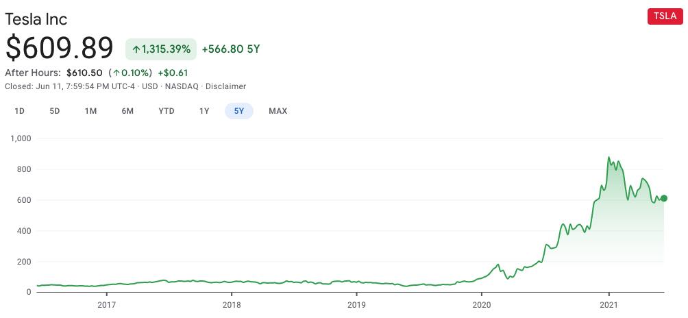 例えば、Tesla(テスラ)の過去5年間のチャートを見てみましょう。