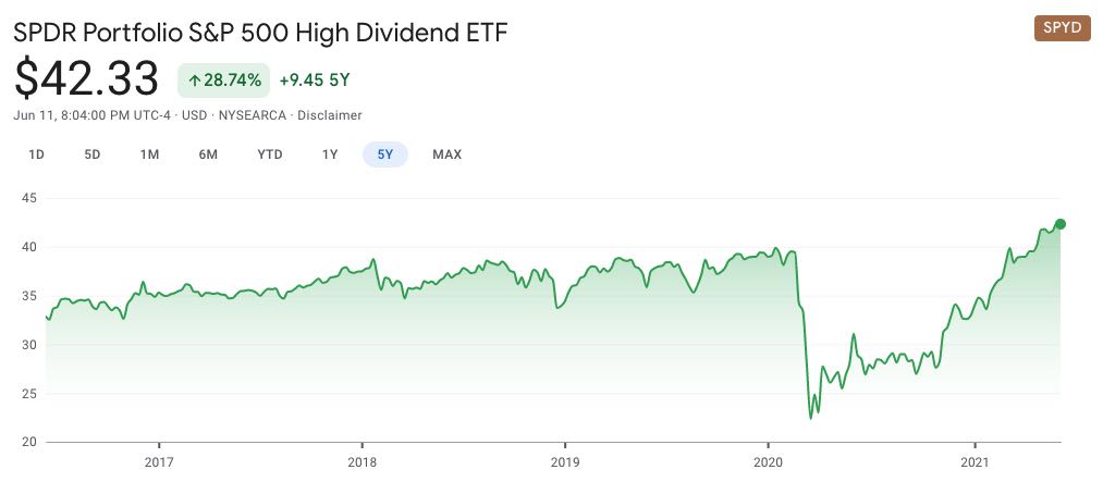 S&P500という代表的な米国のETFを使って、高配当株(SPYD)と成長株(SPY)を比較してみます。
