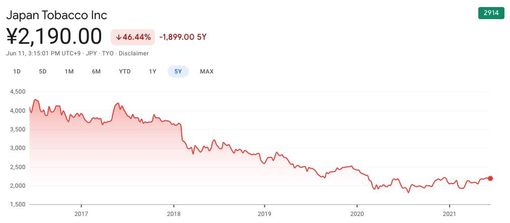 つまり、2016年に資産1,000万円をJTの株として持っている人は、2021年時点で540万円まで下がっています。
