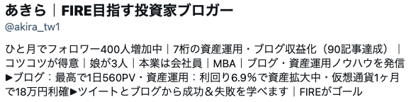 この記事を書いた時点でのわたしは、『あきら|FIRE目指す投資家ブロガー』。