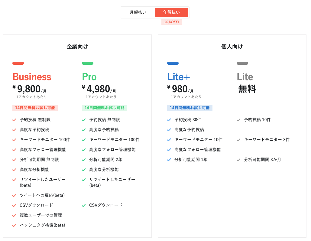 わたしのようにTwitterしたいけど、ずっと張り付いてられない、予約ツイートしたいという方は、Lite+プランを試してみましょう。