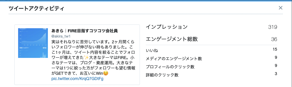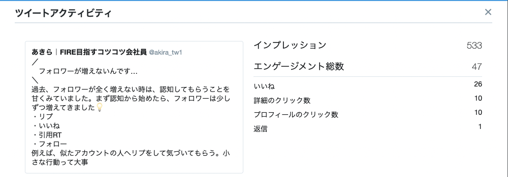 フォロー率、プロフクリック率など考えながら、Twitter運営することで少しずつフォロワー数が伸びました。
